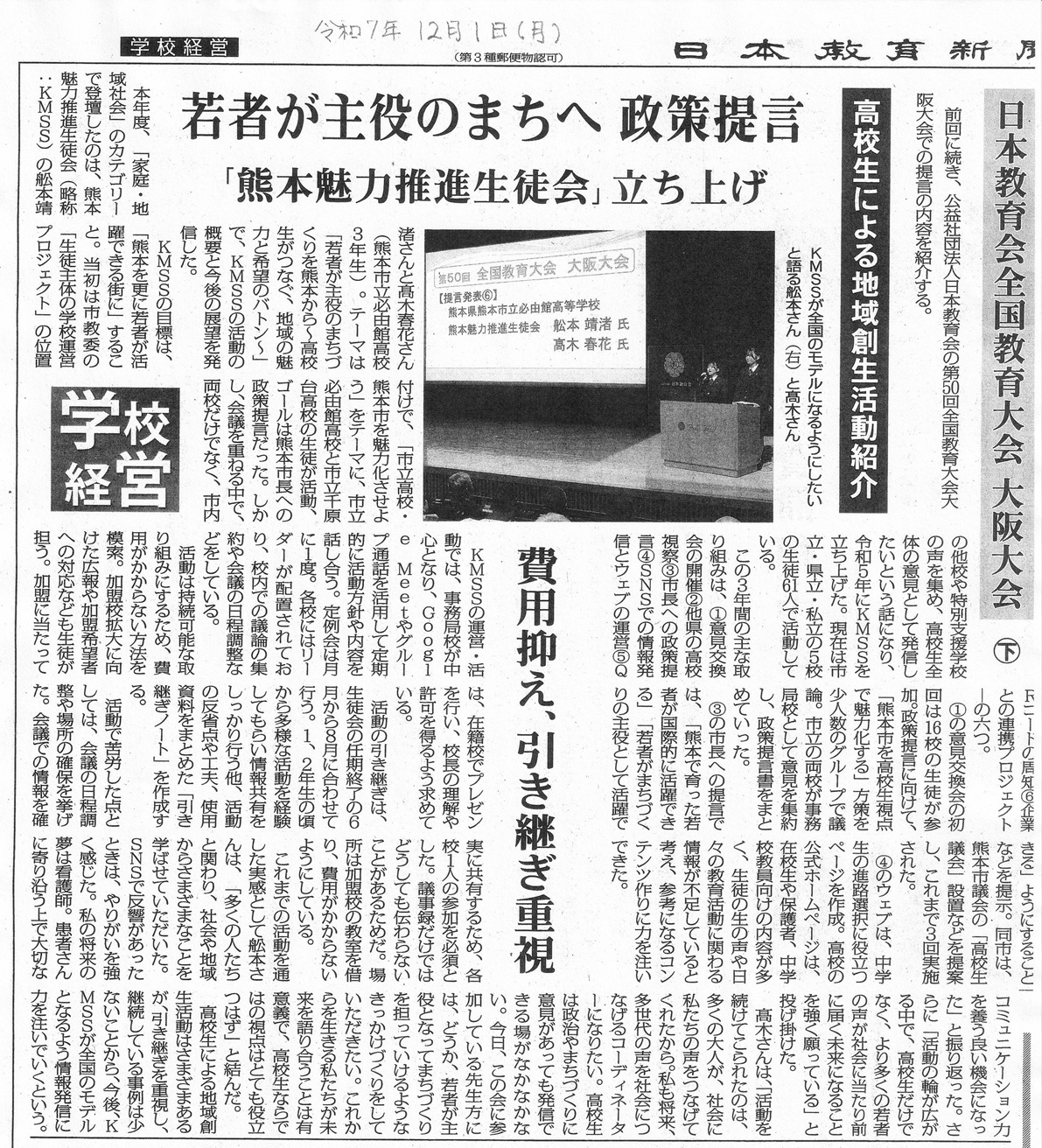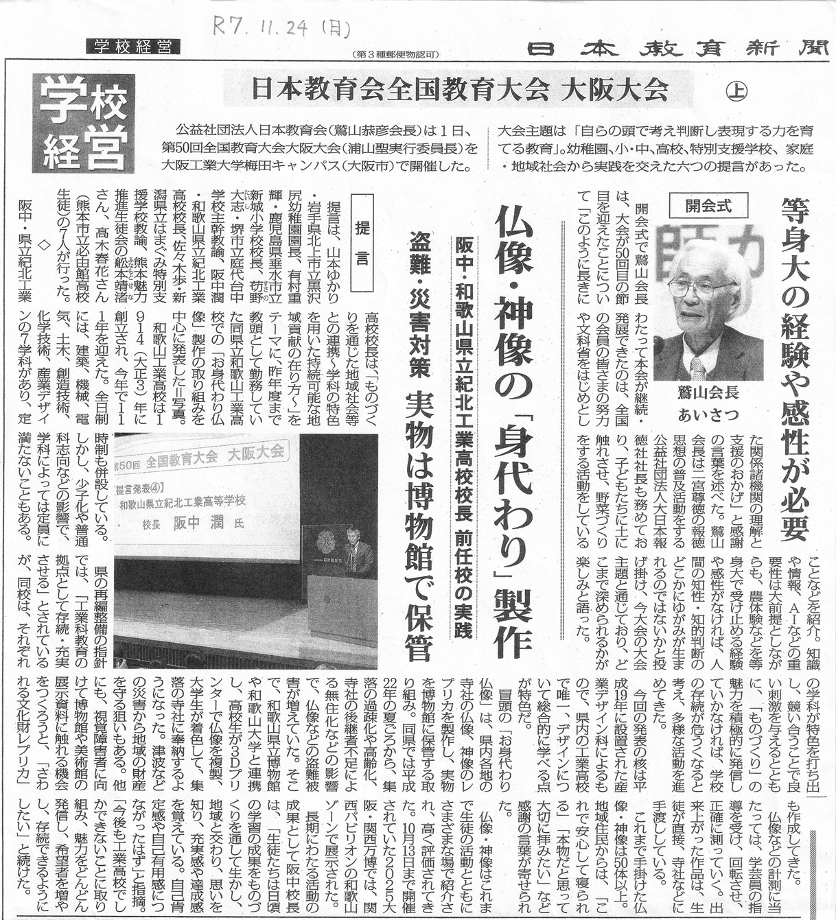 令和7年11月1日の第50回全国教育大会の記事が、二度にわたり日本教育新聞に掲載されました。鷲山会長の開会あいさつと六つの提言のうちの二つが紹介されました。